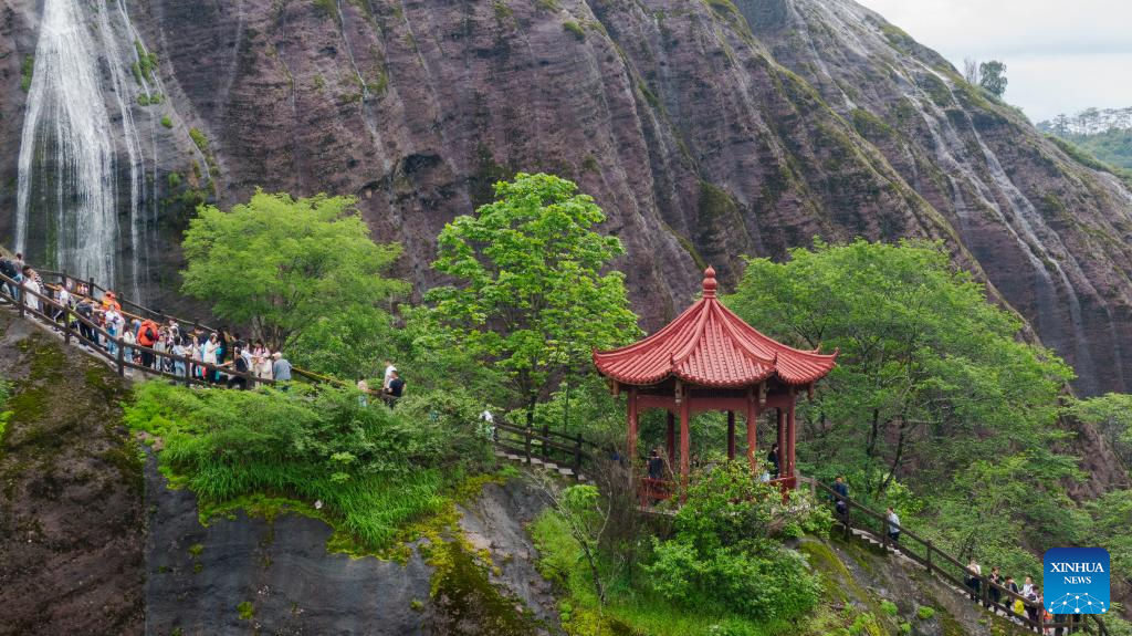 Tourists visit a scenic spot in Wuyi Mountain, southeast China's Fujian Province, April 29, 2023. China is witnessing a travel boom during this year's five-day May Day holiday. (Photo by Chen Ying/Xinhua)