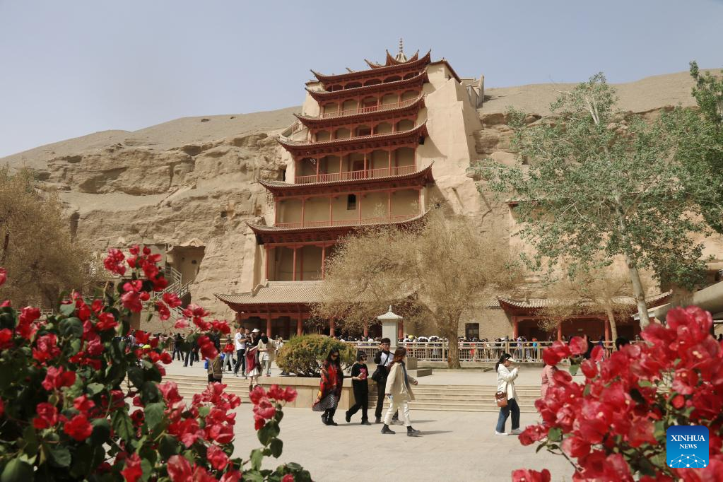 Tourists visit the Mogao Grottoes in Dunhuang, northwest China's Gansu Province, May 2, 2023. A group of young technicians have sought to use digital technology to ensure the permanent preservation and sustainable use of cultural relics in the Mogao Grottoes, a UNESCO World Heritage site in Dunhuang. (Xinhua/Zhang Xiaoliang)