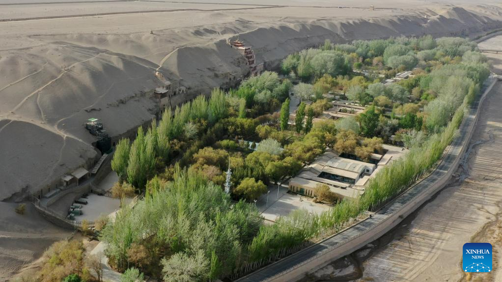 This aerial photo taken on April 25, 2023 shows the cave area of the Mogao Grottoes in Dunhuang, northwest China's Gansu Province. A group of young technicians have sought to use digital technology to ensure the permanent preservation and sustainable use of cultural relics in the Mogao Grottoes, a UNESCO World Heritage site in Dunhuang. (Xinhua/Fang Xin)