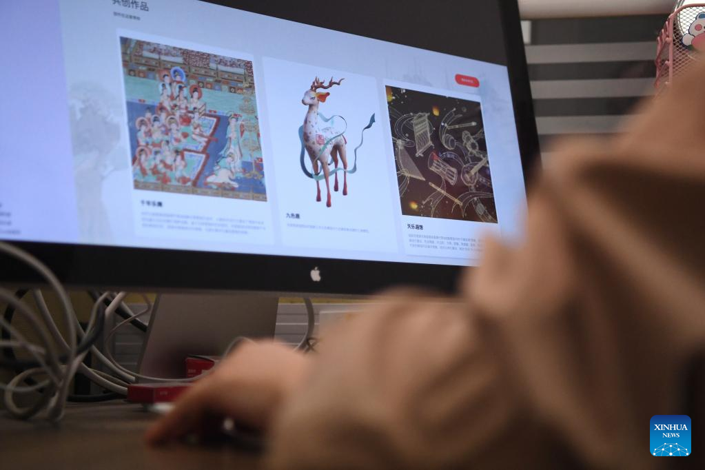 Han Xue, a member of the Dunhuang Academy's digital preservation team, looks up "Digital Dunhuang" website in Dunhuang, northwest China's Gansu Province, April 25, 2023. A group of young technicians have sought to use digital technology to ensure the permanent preservation and sustainable use of cultural relics in the Mogao Grottoes, a UNESCO World Heritage site in Dunhuang. (Xinhua/Chen Bin)