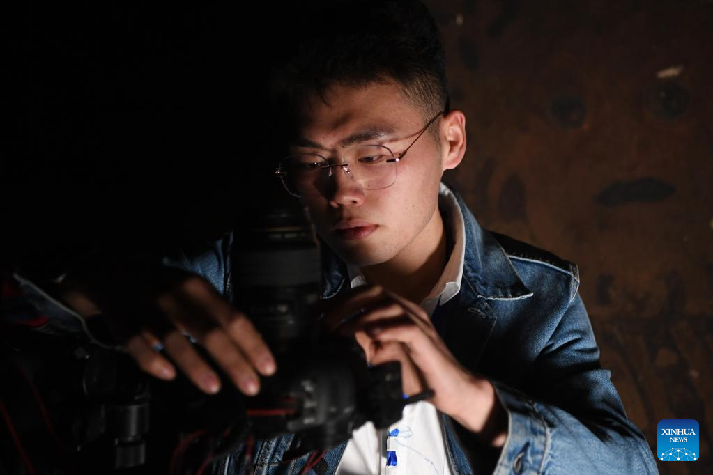 Xiong Yeteng, a technician from the Dunhuang Academy's digital preservation team, prepares to collect images of murals in a cave of the Mogao Grottoes in Dunhuang, northwest China's Gansu Province, April 25, 2023. A group of young technicians have sought to use digital technology to ensure the permanent preservation and sustainable use of cultural relics in the Mogao Grottoes, a UNESCO World Heritage site in Dunhuang. (Xinhua/Fang Xin)