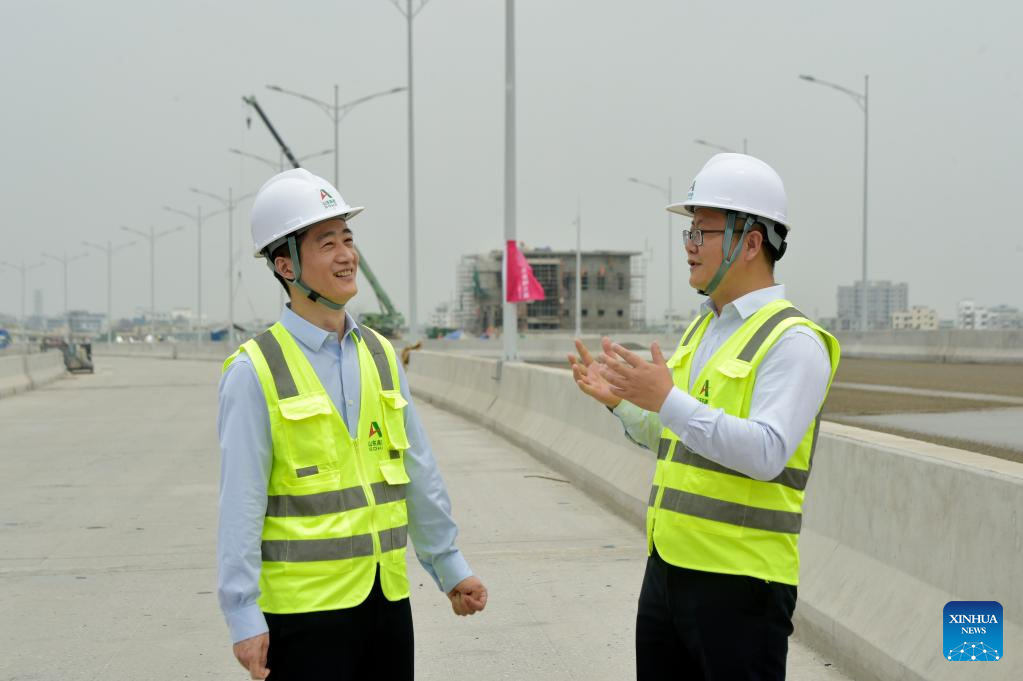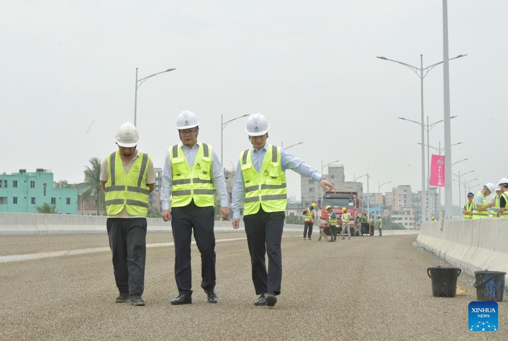 Yao Yao (1st R), the finance manager of the Asia-Pacific company of China Shandong International Economic and Technical Cooperation Ltd., works for the Dhaka Elevated Expressway project in Dhaka, Bangladesh on May 3, 2023.(Xinhua)