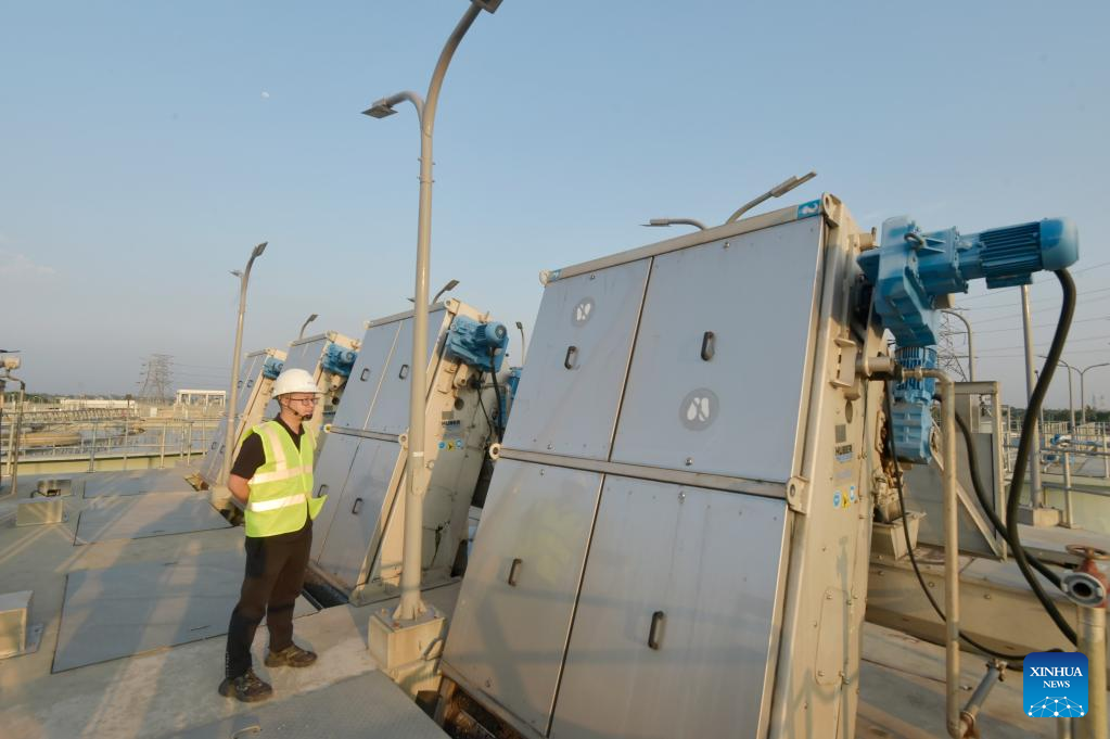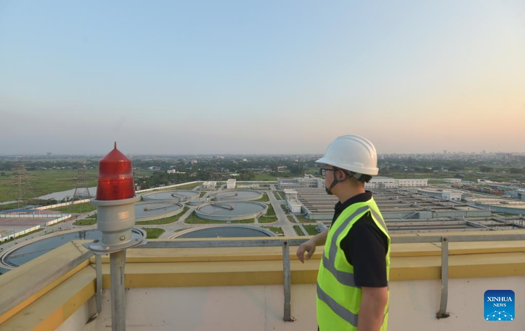 Deng Mingze, deputy manager of the Dasherkandi Sewage Treatment Plant project, checks the running status of the project in Dhaka, Bangladesh on May 2, 2023.(Xinhua)
