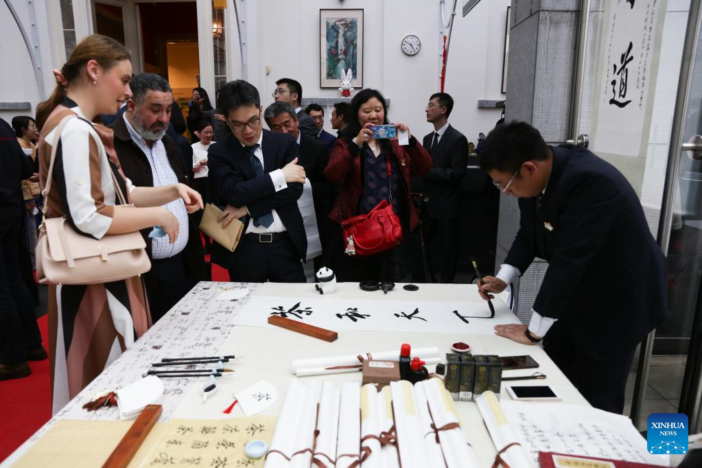 People watch Chinese calligraphy demonstration during an opening ceremony of Yaji Cultural Salon "Tea for Harmony" at China Cultural Center in Brussels, Belgium, on May 4, 2023. (Xinhua/Zheng Huansong)