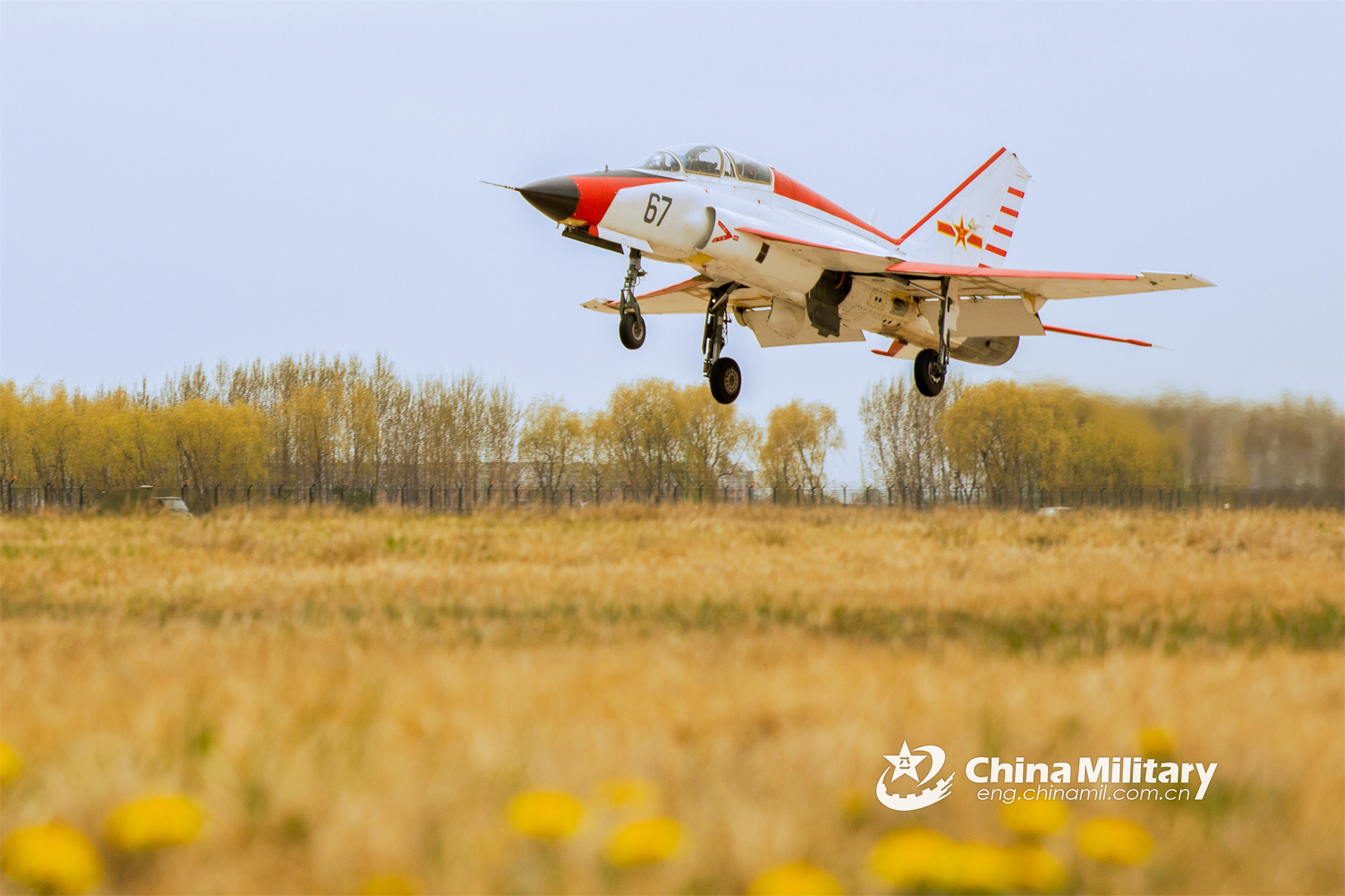 A jet trainer attached to a training regiment of the PLA Naval Aviation University takes off in an assessment on field carrier landing practice (FCLP) recently. (eng.chinamil.com.cn/Photo by Lan Pengfei)