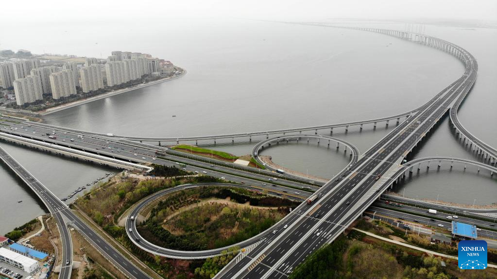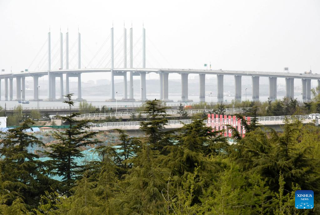 This photo taken on April 14, 2023 shows the Jiaozhou Bay Bridge in Qingdao, east China's Shandong Province. (Xinhua/Li Ziheng)