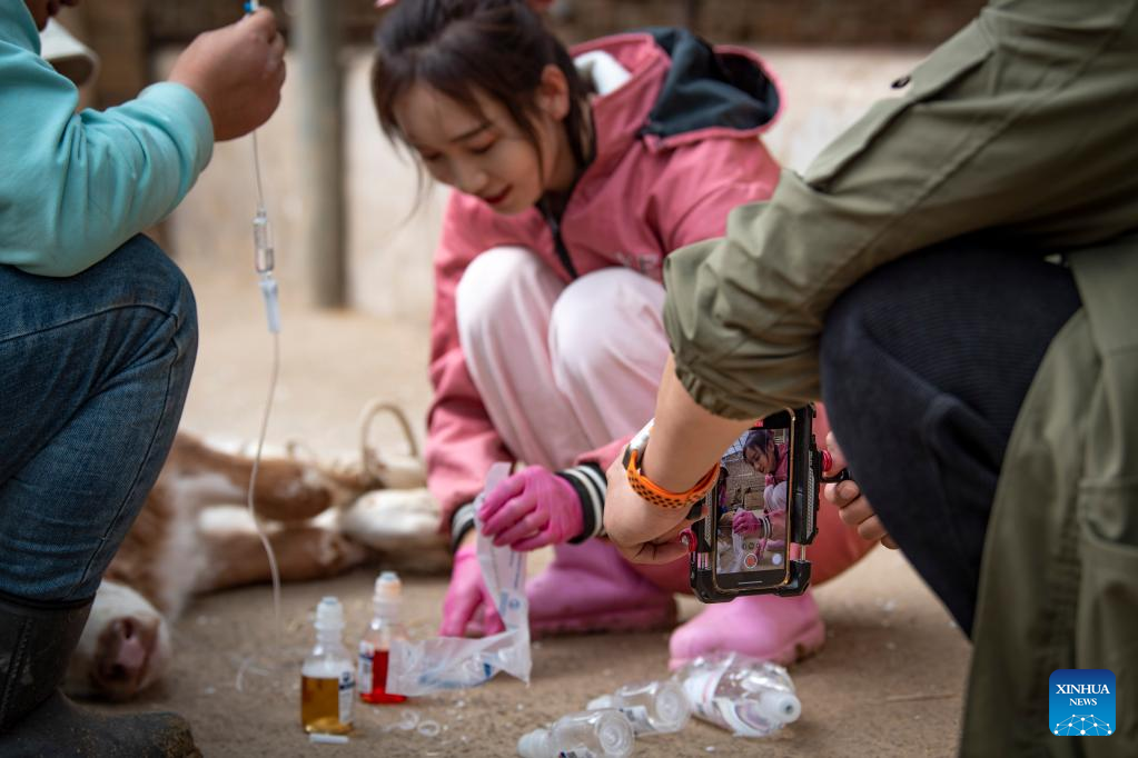 A colleague of Veterinarian Bai Hua (C) helps her take video sharing her work on internet in Guyuan, northwest China's Ningxia Hui Autonomous Region, April 18, 2023.?(Xinhua/Feng Kaihua)