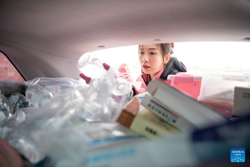 Veterinarian Bai Hua arranges medicines in the trunk of her car in front of her veterinary clinic in Yuanzhou District, Guyuan, northwest China's Ningxia Hui Autonomous Region, April 18, 2023. (Xinhua/Feng Kaihua)
