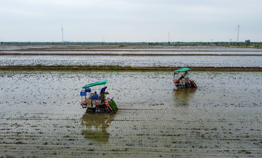 This aerial photo taken on May 5, 2023 shows farmers operating transplanters to transplant rice seedlings at an agricultural products development and demonstration center in north China's Tianjin. (Xinhua/Sun Fanyue)