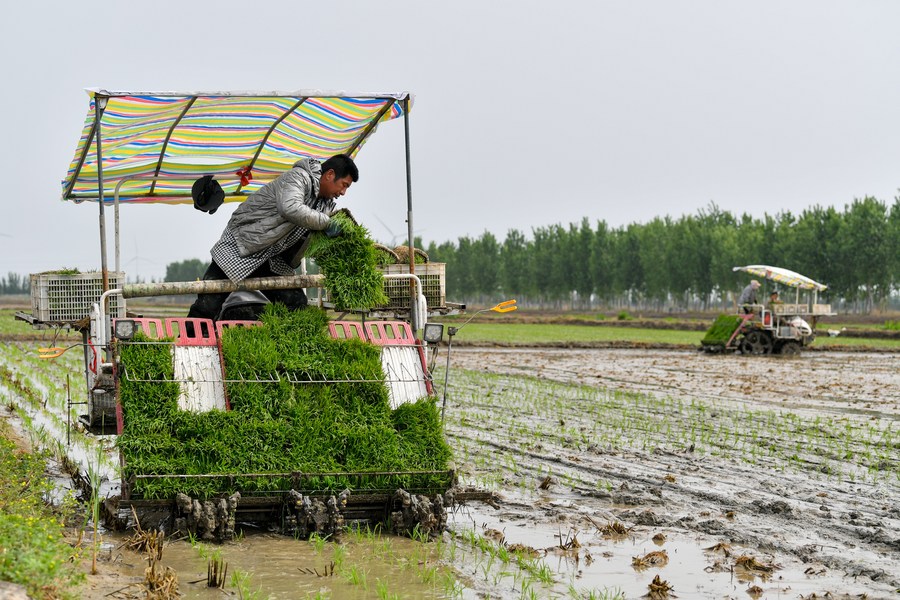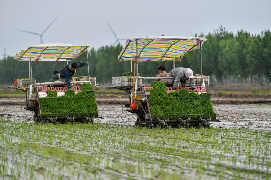 Farmers load rice seedlings onto a transplanter at an agricultural products development and demonstration center in north China's Tianjin, May 5, 2023. (Xinhua/Sun Fanyue)