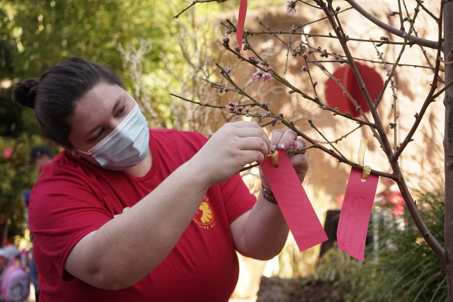 A woman attaches a note of wishes on the wish tree at San Diego Zoo, in San Diego, California, the United States, on Feb. 4, 2023. (Photo by Zeng Hui/ Xinhua)