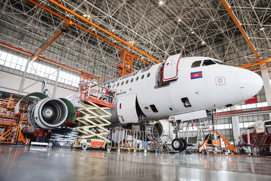 HAIKOU, May 5 (Xinhua) -- An Airbus A320 airplane of Cambodia Airways was parked at a hangar of Hainan Free Trade Port's aircraft maintenance base to receive examination and maintenance services provided by GCAM on Friday.