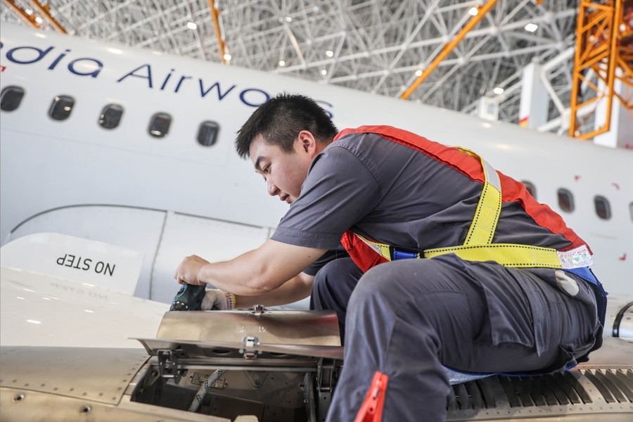 A worker of Grand China Aviation Maintenance Co., Ltd. (GCAM) maintains an airplane in Haikou, capital of south China's Hainan Province, May 5, 2023. (Xinhua/Zhang Liyun)