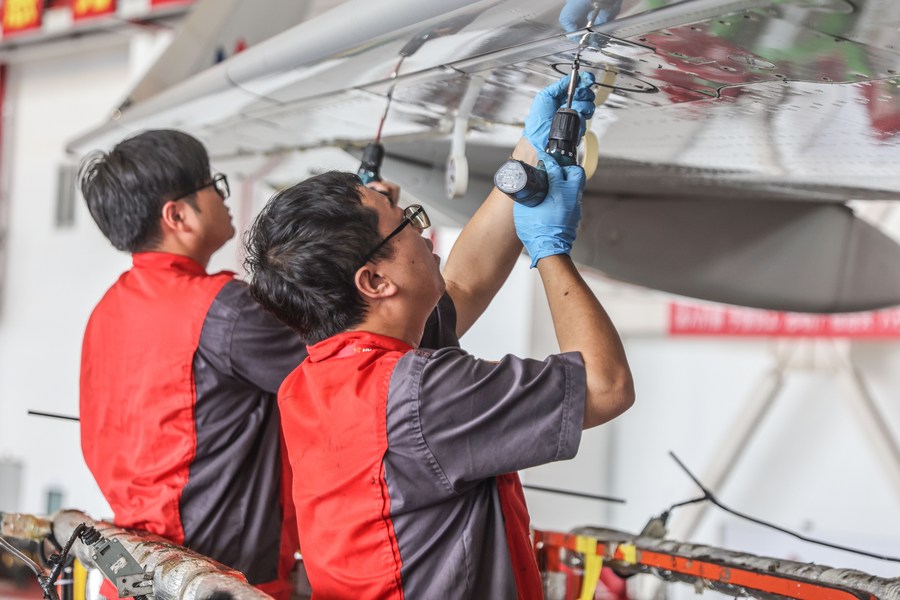 Workers of Grand China Aviation Maintenance Co., Ltd. (GCAM) maintain an airplane in Haikou, capital of south China's Hainan Province, May 5, 2023. (Xinhua/Zhang Liyun)