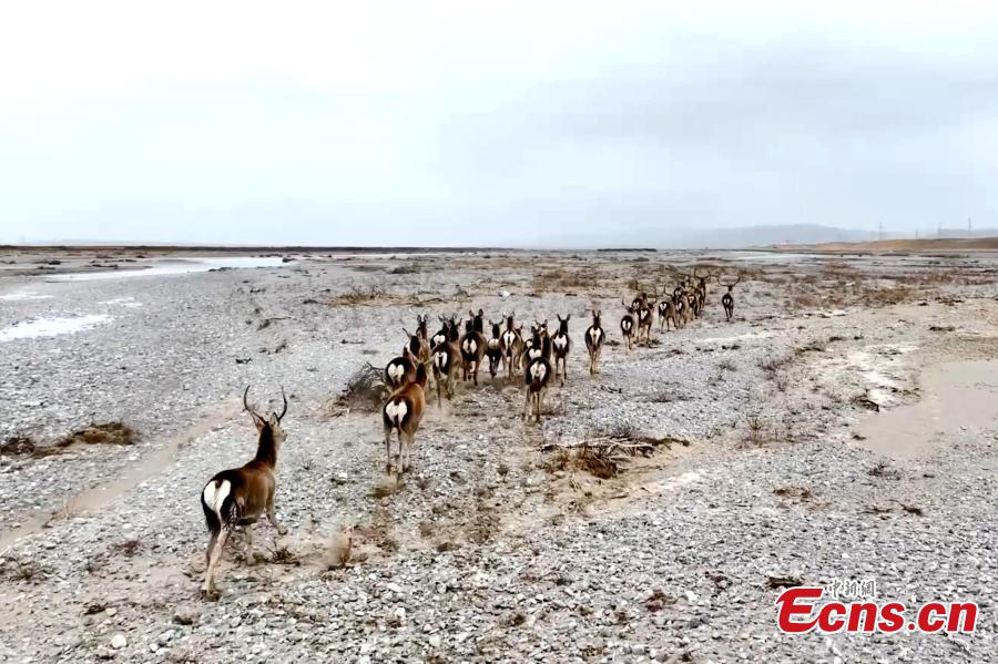 A herd of red deer wander on the bank of the Buha River in Gangcha County of Haibei Tibetan Autonomous Prefecture, northwest China's Qinghai Province. (Photo/China News Service)