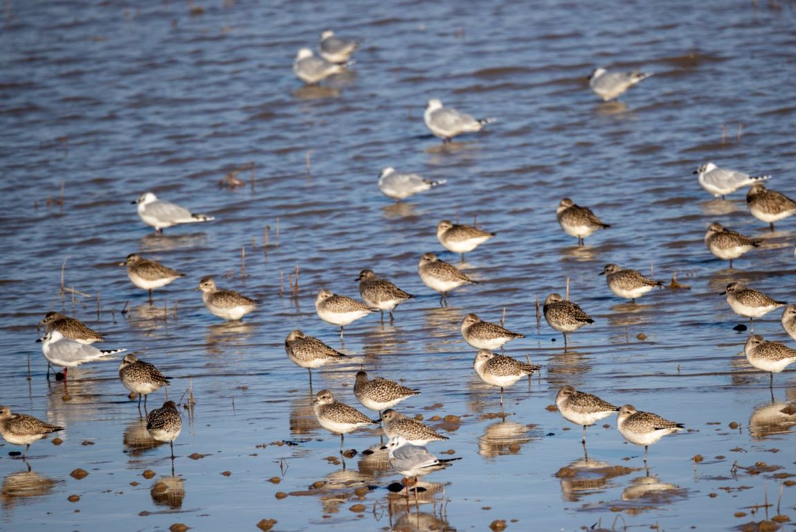 Shorebirds gather at the Tiaozini wetland in Feb 2023. [Photo by Sun Jialu/for chinadaily.com.cn]
