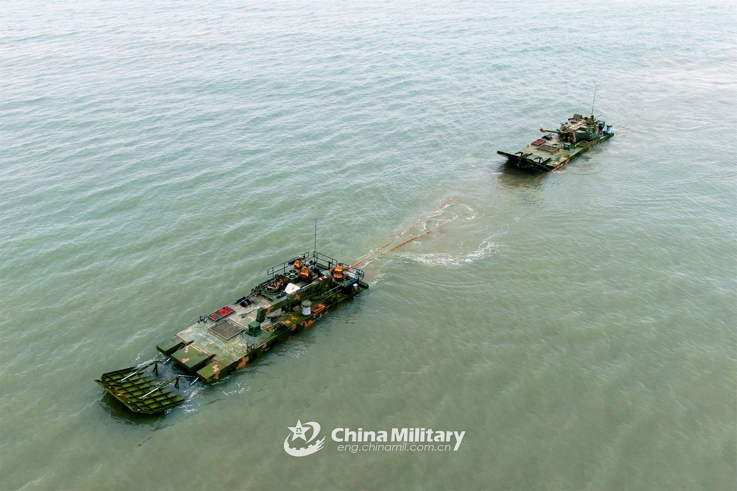 An amphibious armored vehicle for emergency rescue attached to a combined-arms brigade under the PLA 73rd Group Army tows another vehicle toward the coast during a maritime towing and rescue exercise in late April, 2023. (eng.chinamil.com.cn/Photo by Peng Zhifu)