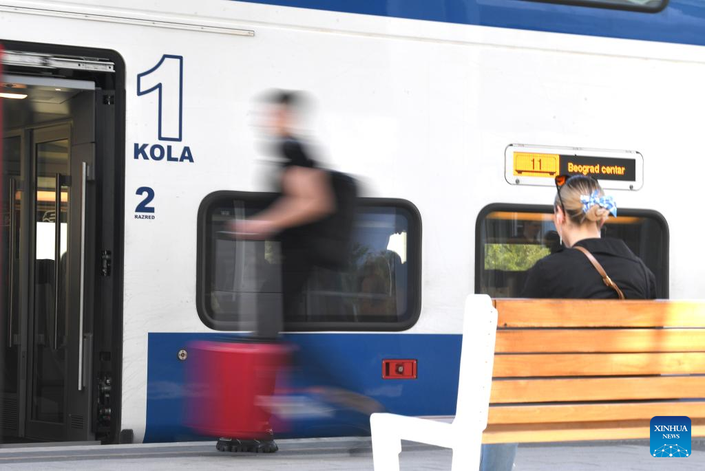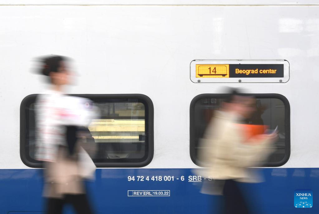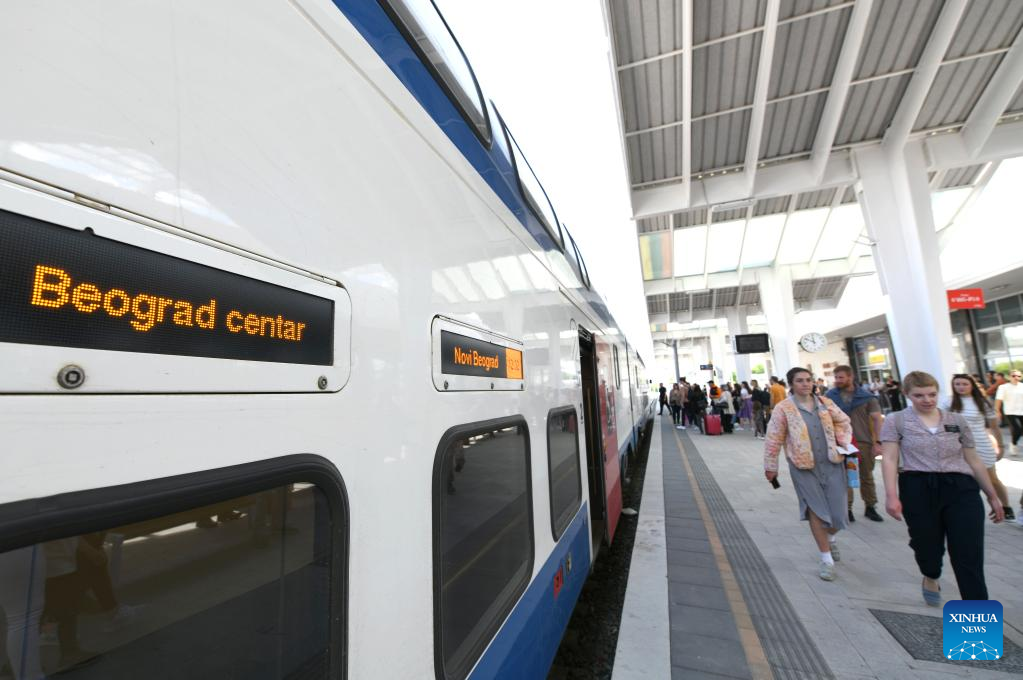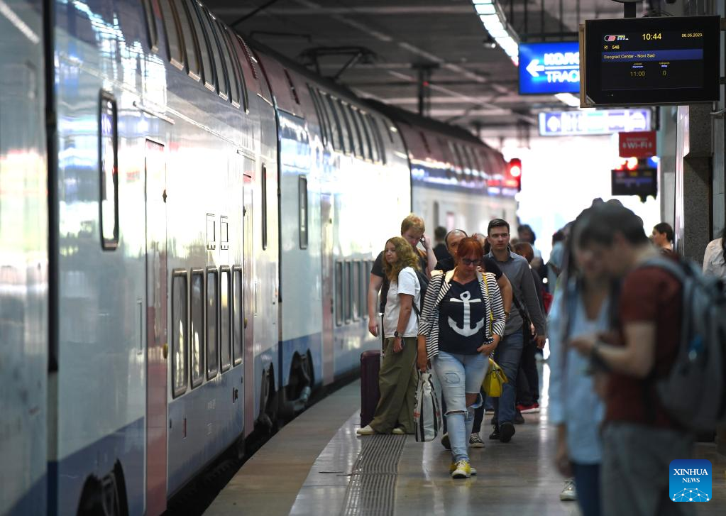 Passengers board a train to Belgrade at Novi Sad station in Serbia, May 6, 2023. The 80-kilometer-long, Chinese-built Belgrade-Novi Sad high-speed railway has been carrying passengers at speeds of up to 200 kilometers per hour since March 2022. (Xinhua/Ren Pengfei)