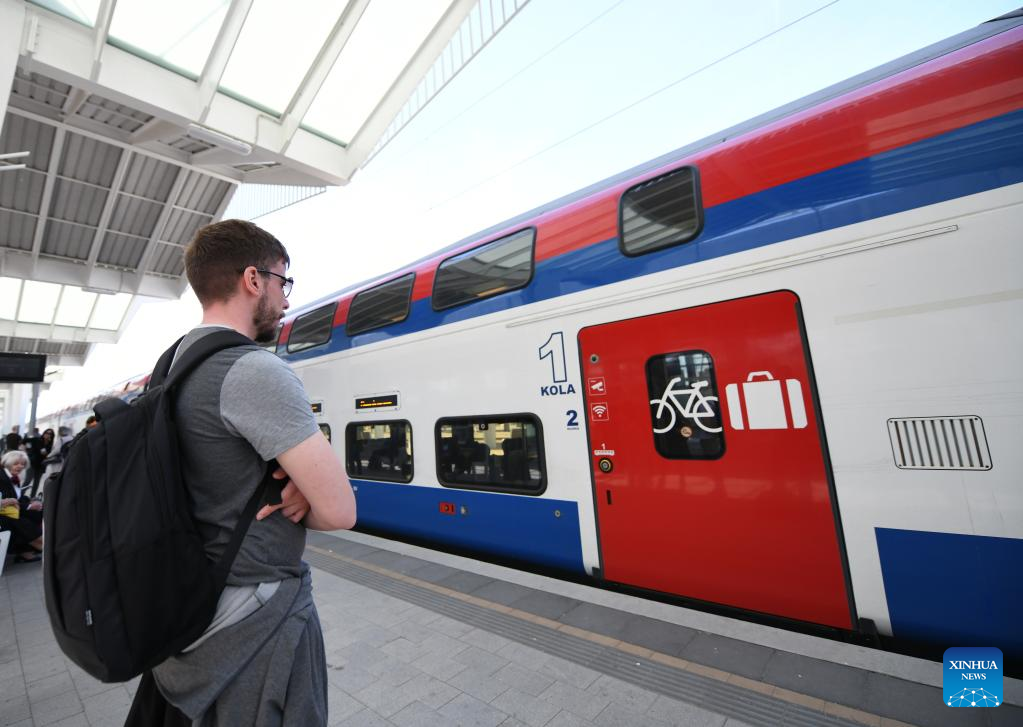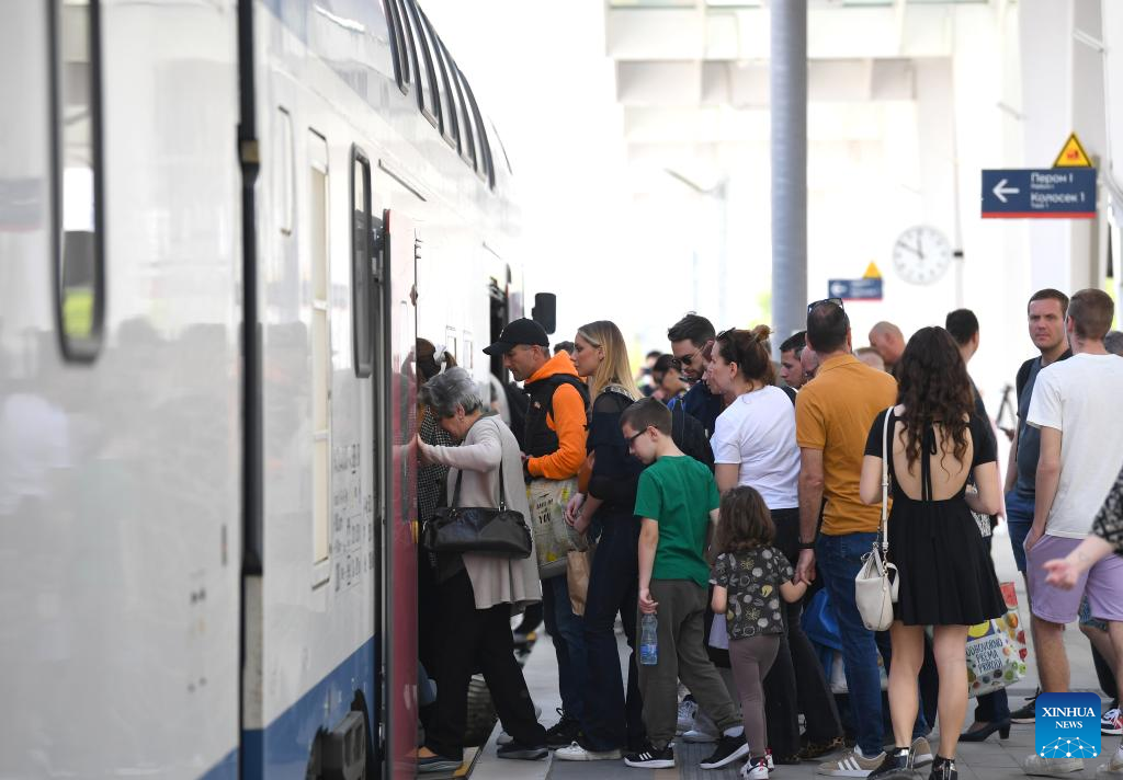 Passengers are to board a train to Belgrade at Novi Sad station in Serbia, May 6, 2023. The 80-kilometer-long, Chinese-built Belgrade-Novi Sad high-speed railway has been carrying passengers at speeds of up to 200 kilometers per hour since March 2022. (Xinhua/Ren Pengfei)