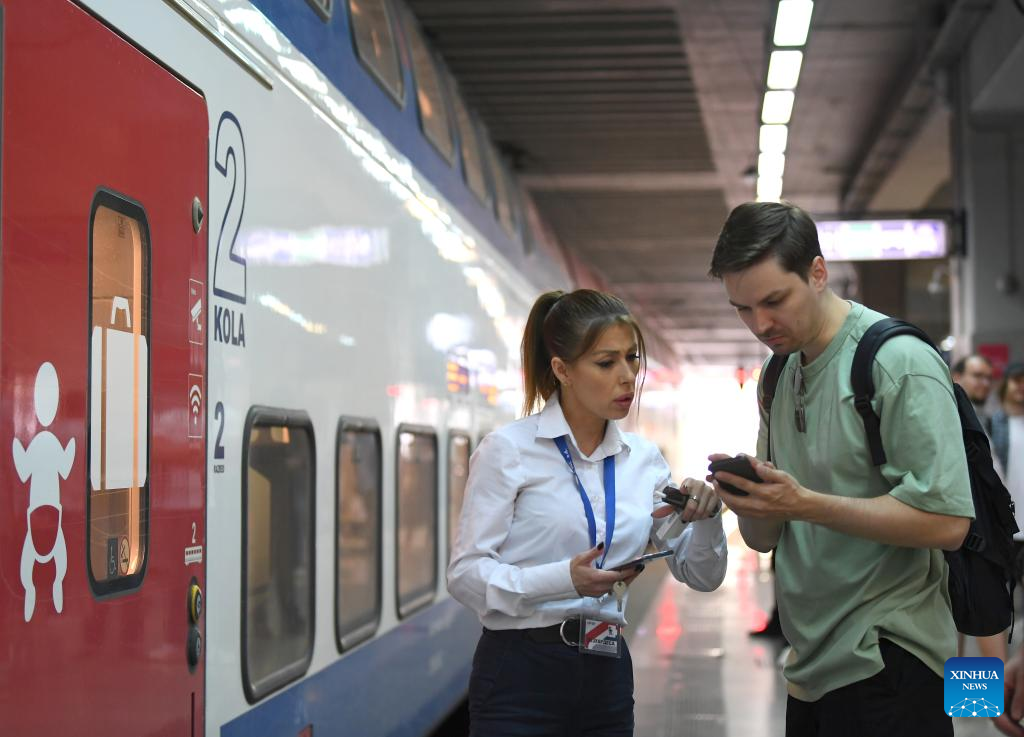 A passenger asks a staff member for help at Belgrade station in Serbia, May 6, 2023. The 80-kilometer-long, Chinese-built Belgrade-Novi Sad high-speed railway has been carrying passengers at speeds of up to 200 kilometers per hour since March 2022. (Xinhua/Ren Pengfei)