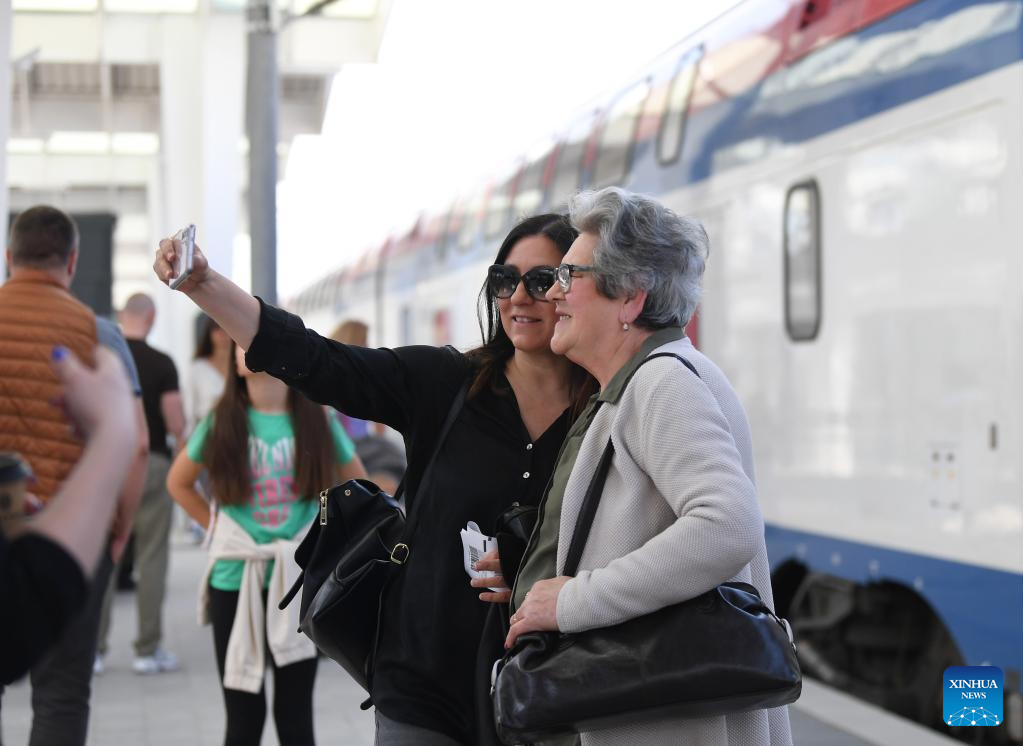 Passengers take a selfie at Novi Sad station in Serbia, May 6, 2023. The 80-kilometer-long, Chinese-built Belgrade-Novi Sad high-speed railway has been carrying passengers at speeds of up to 200 kilometers per hour since March 2022. (Xinhua/Ren Pengfei)