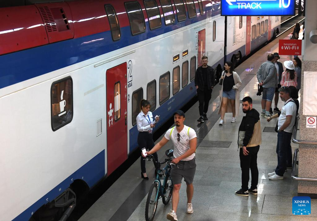 Passengers are to board a train to Novi Sad at the Belgrade station in Serbia, May 6, 2023. The 80-kilometer-long, Chinese-built Belgrade-Novi Sad high-speed railway has been carrying passengers at speeds of up to 200 kilometers per hour since March 2022. (Xinhua/Ren Pengfei)