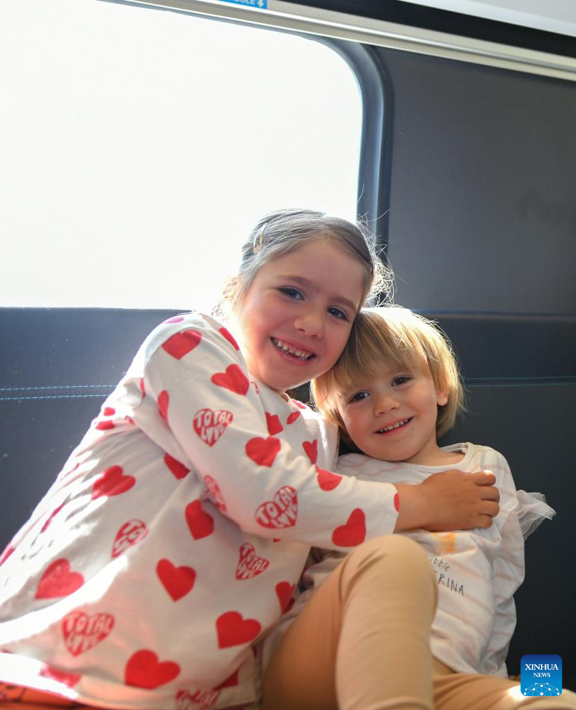 Kids pose for a photo on a train from Belgrade to Novi Sad in Serbia, May 6, 2023. The 80-kilometer-long, Chinese-built Belgrade-Novi Sad high-speed railway has been carrying passengers at speeds of up to 200 kilometers per hour since March 2022. (Xinhua/Ren Pengfei)