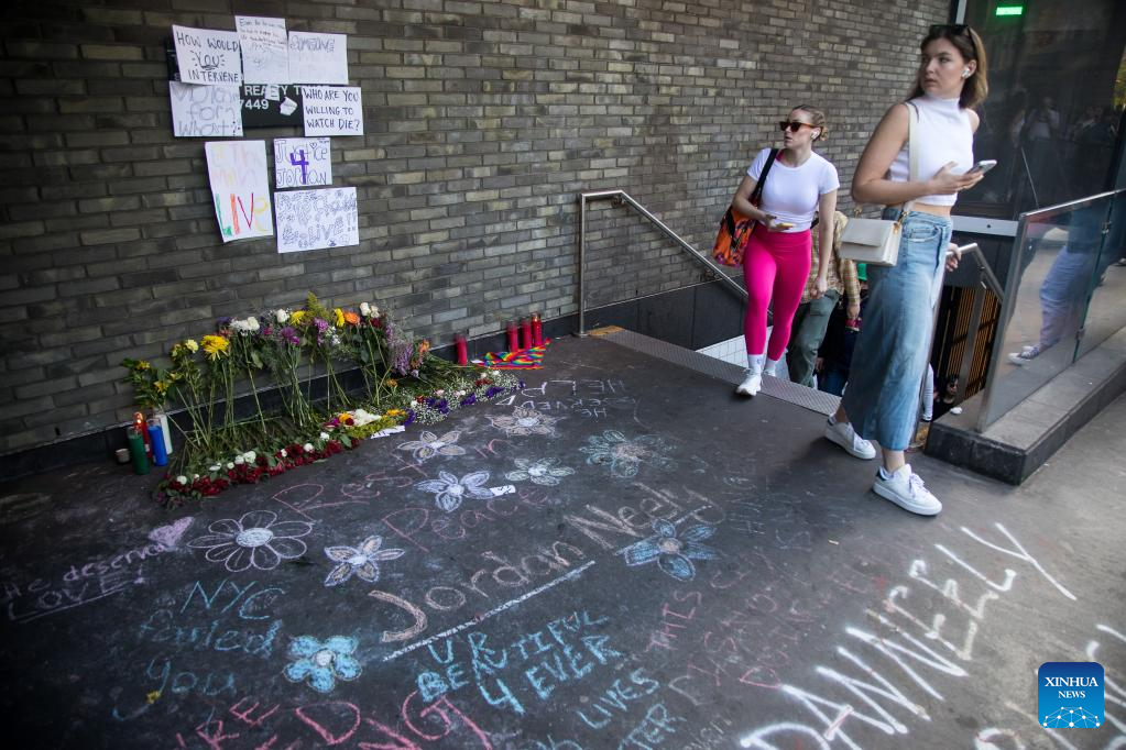 People lay flowers and candles to mourn Jordan Neely in New York, the United States, May 6, 2023. (Photo by Michael Nagle/Xinhua)