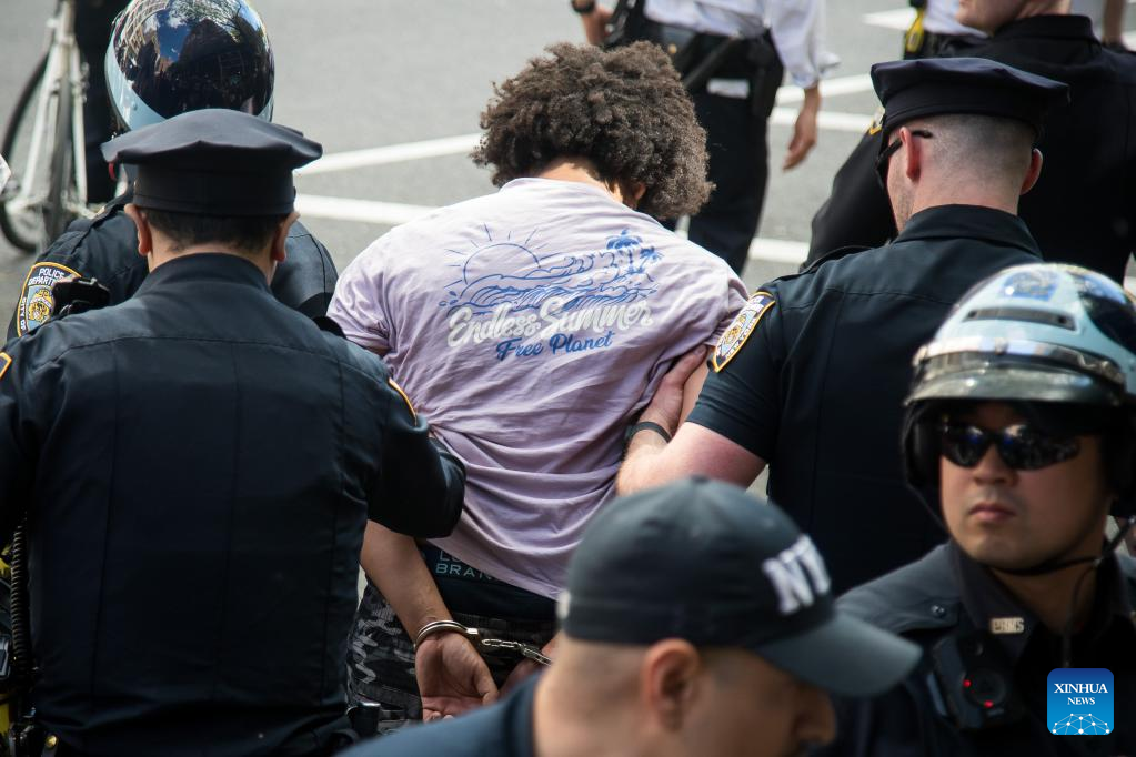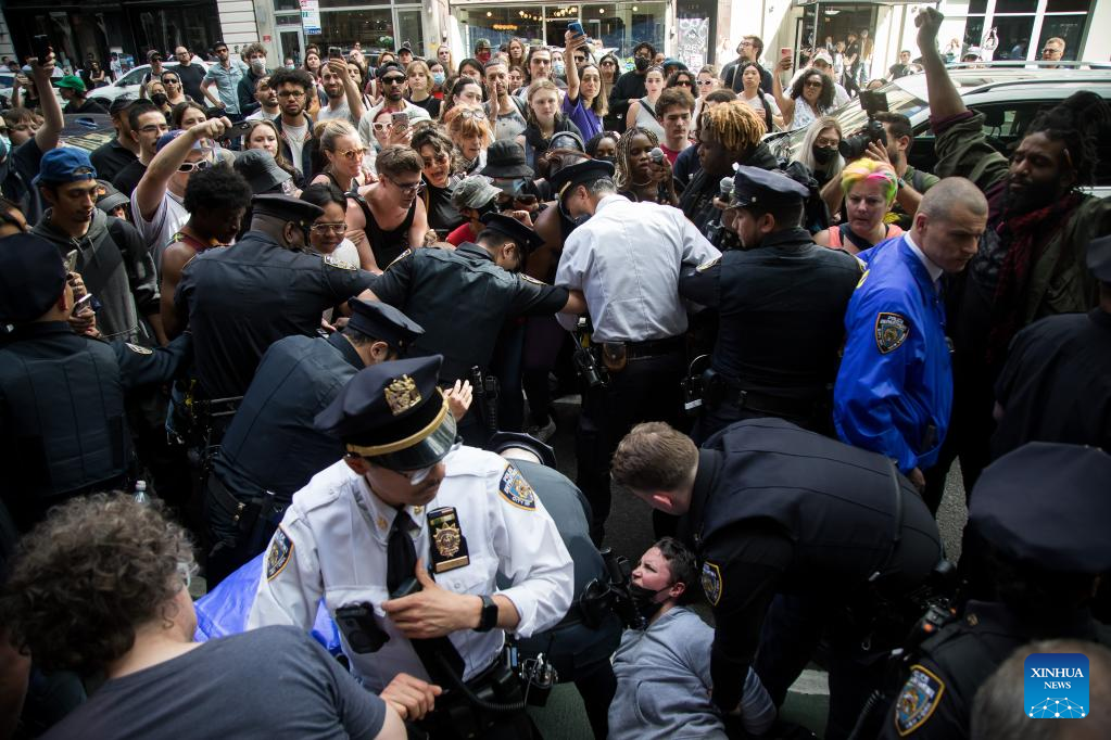 Police officers arrest a protester during a protest over chokehold death of a black man in New York, the United States, May 6, 2023. (Photo by Michael Nagle/Xinhua)