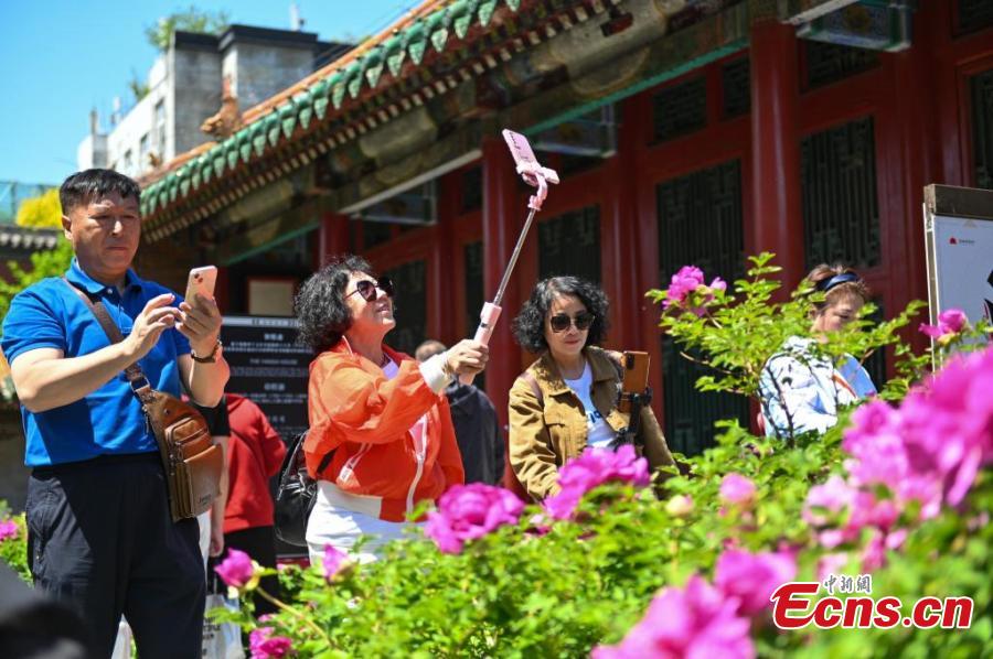 Visitors take photos of the blooming peonies at the Shengyang Imperial Palace in northeast China's Liaoning Province, May 7, 2023. (Photo: China News Service/Yu Haiyang)