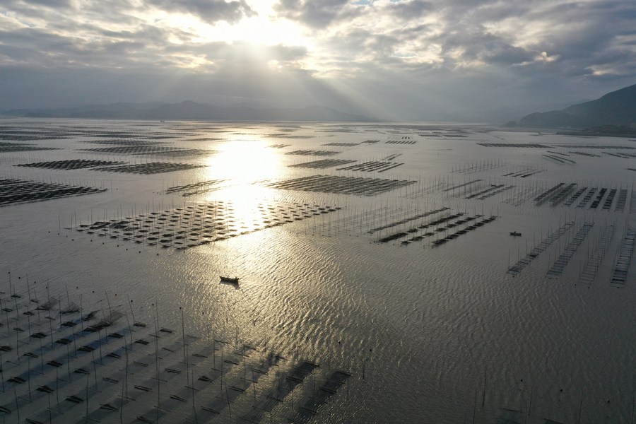 This aerial photo taken on Jan. 5, 2023 shows fishermen working at a marine ranch in Lianjiang County of Fuzhou, southeast China's Fujian Province. (Photo by Wang Wangwang/Xinhua)