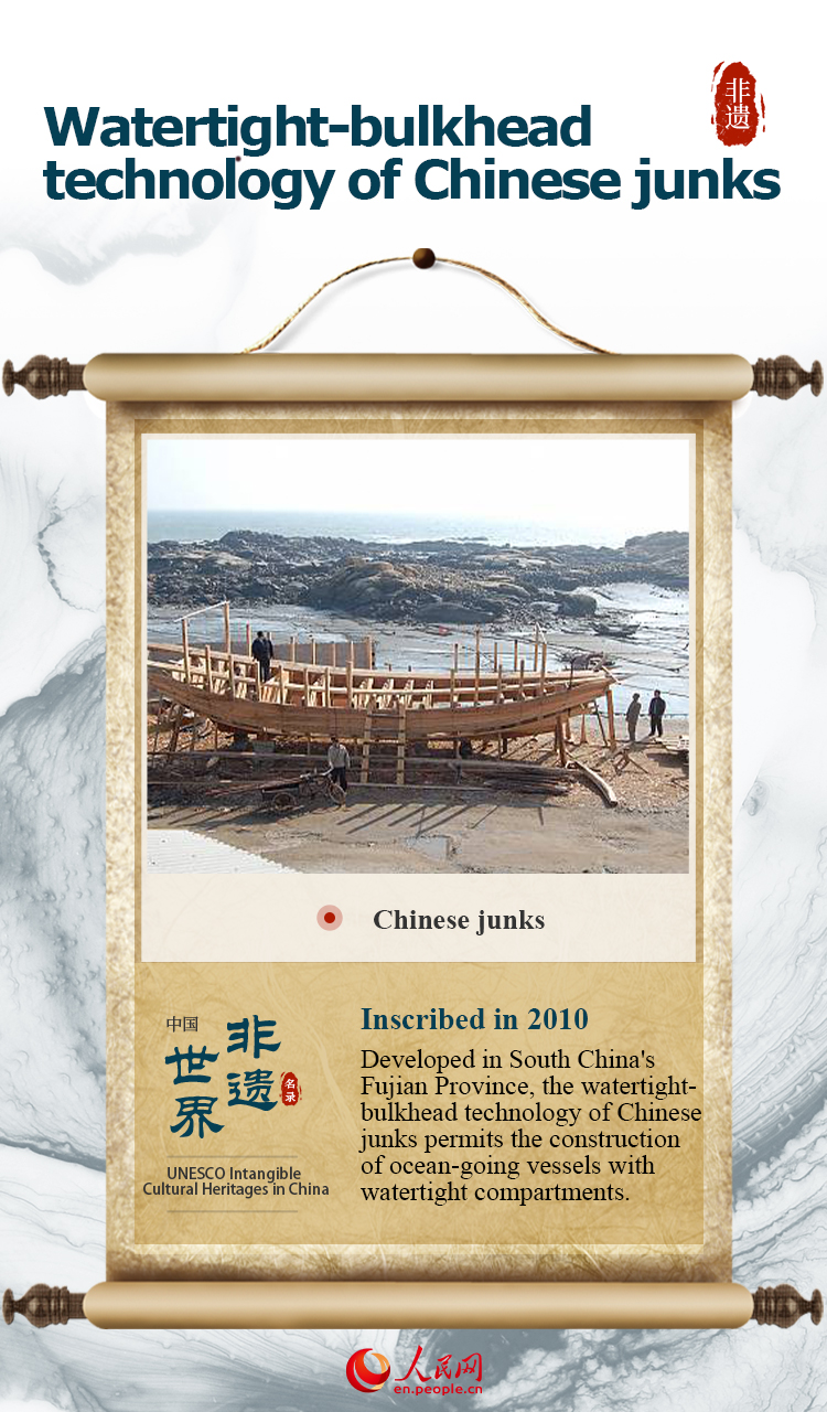 The term, "Watertight-bulkhead technology of Chinese junks" was inscribed on UNESCO's List of Intangible Cultural Heritage in Need of Urgent Safeguarding in 2010.