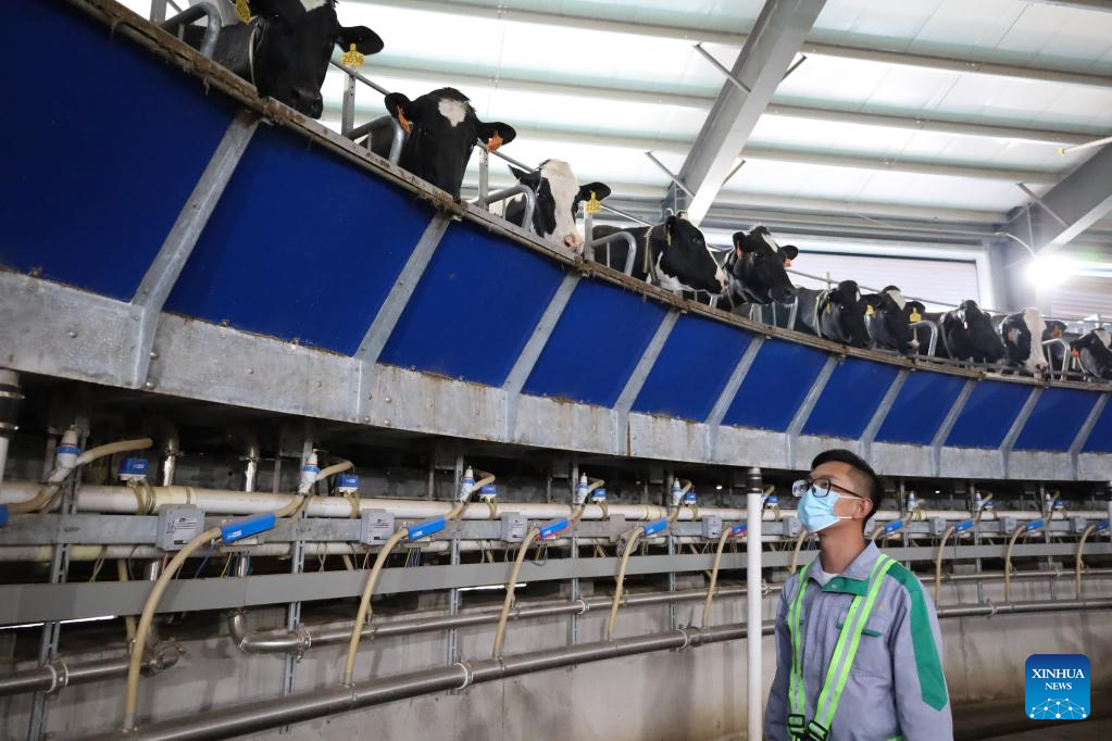 A staff member checks a rotary milking machine at a dairy farm in Wuwei, northwest China's Gansu Province, May 7, 2023. (Xinhua/Ma Xiping)