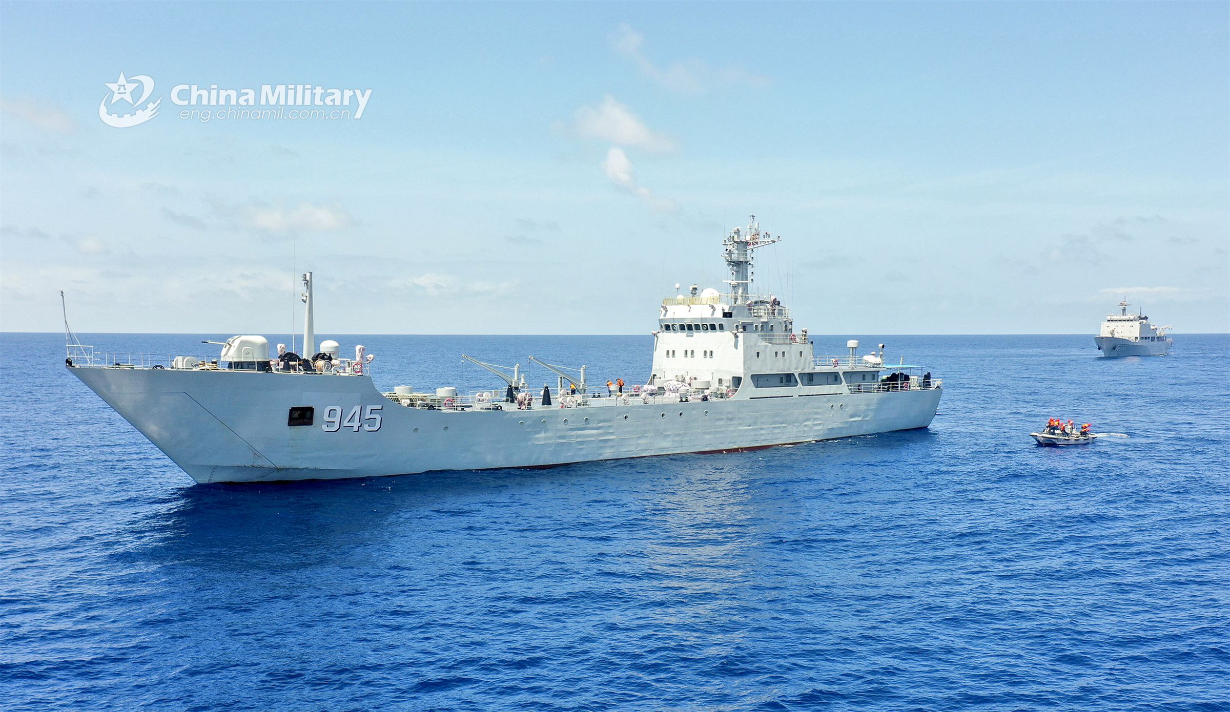 A speed boat attached to a naval service ship group under the PLA Southern Theater Command approaches a simulated war-damaged vessel to provide damage control support during a maritime search and rescue exercise in late April, 2023. (eng.chinamil.com.cn/Photo by Wu Huanqing)