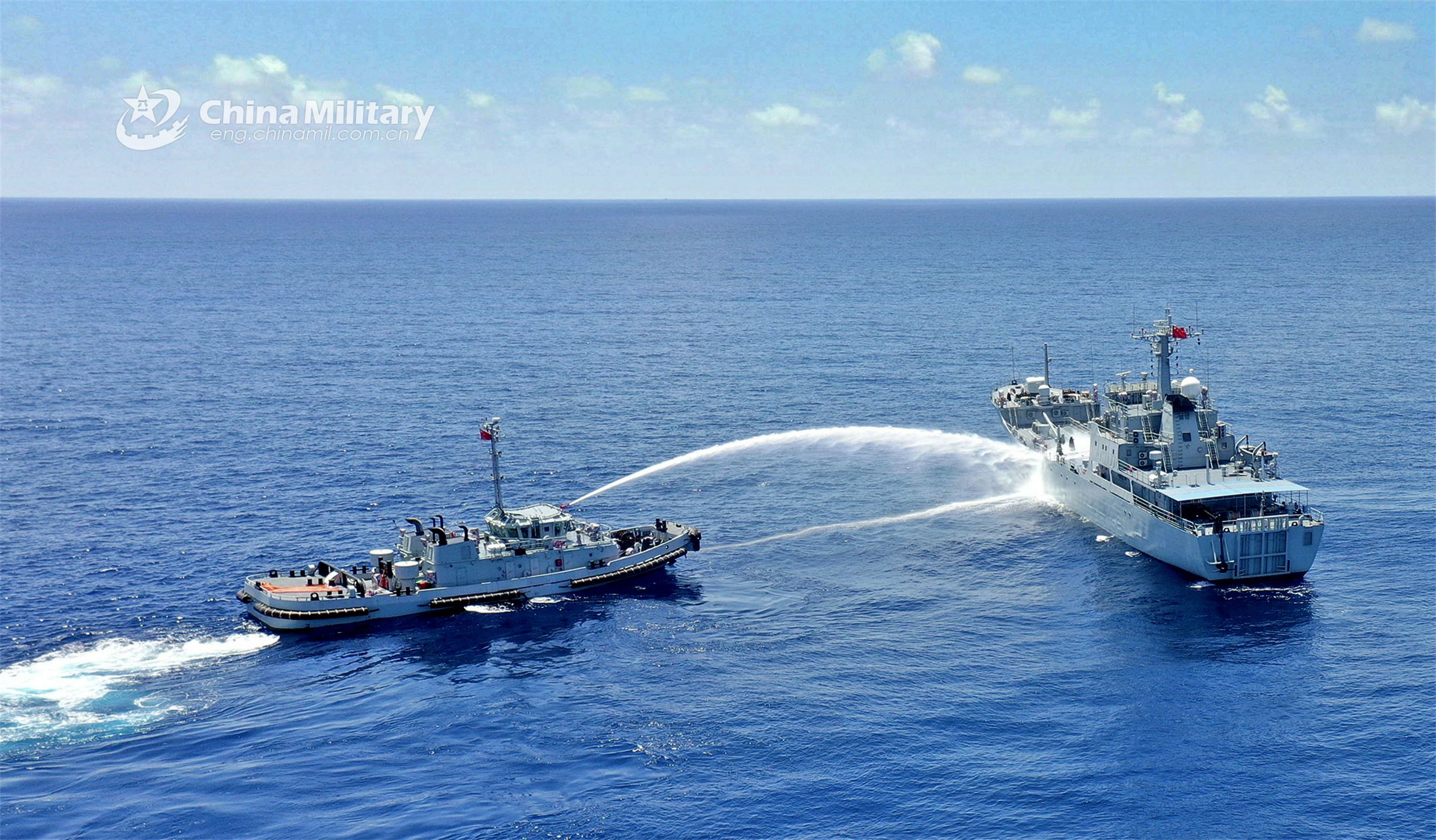 A rescue ship attached to a naval service ship group under the PLA Southern Theater Command sprays water toward a simulated war-damaged vessel to put out the fire during a maritime search and rescue exercise in late April, 2023. (eng.chinamil.com.cn/Photo by Wu Huanqing)
