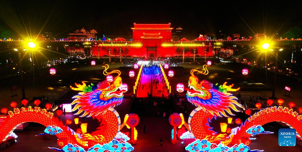 This aerial photo taken on Jan. 26, 2023 shows lanterns outside the Yongning Gate of the ancient city wall in Xi'an, northwest China's Shaanxi Province. (Xinhua/Liu Xiao)