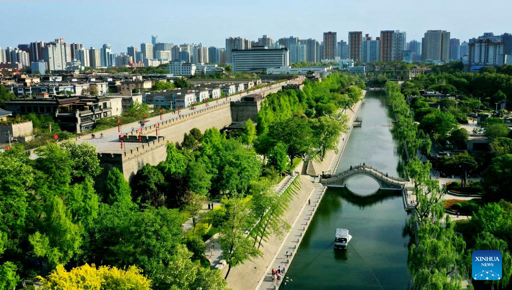 This aerial photo taken on April 15, 2023 shows a view of a scenic moat area along the ancient city wall in Xi'an, northwest China's Shaanxi Province. (Xinhua/Liu Xiao)?