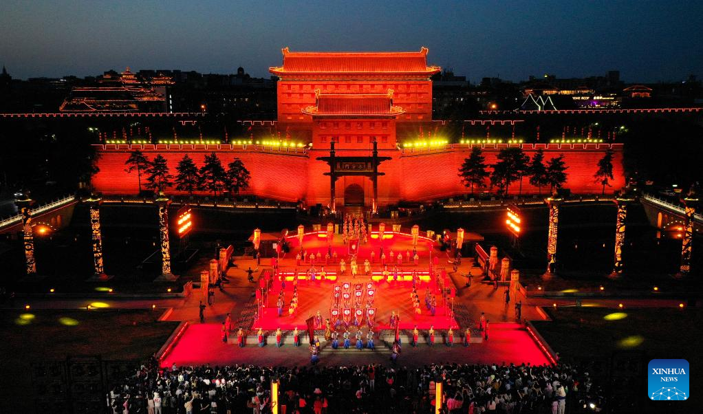 This aerial photo taken on April 30, 2023 shows tourists watching performances at the ancient city wall scenic spot in Xi'an, northwest China's Shaanxi Province. (Xinhua/Liu Xiao)