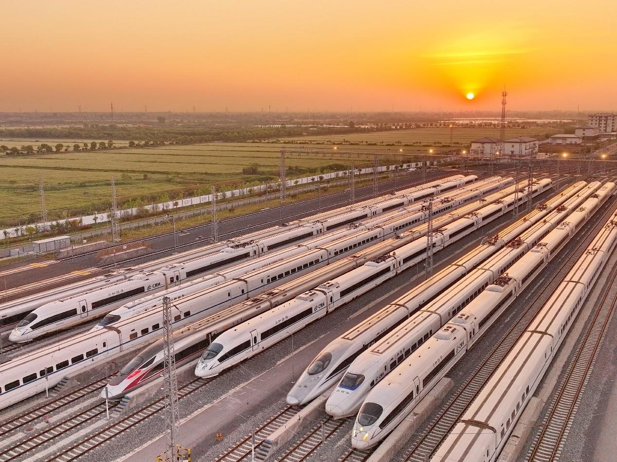 Photo taken on April 30, 2023 shows bullet trains in Nantong, east China's Jiangsu province. (People's Daily Online/Xu Congjun)