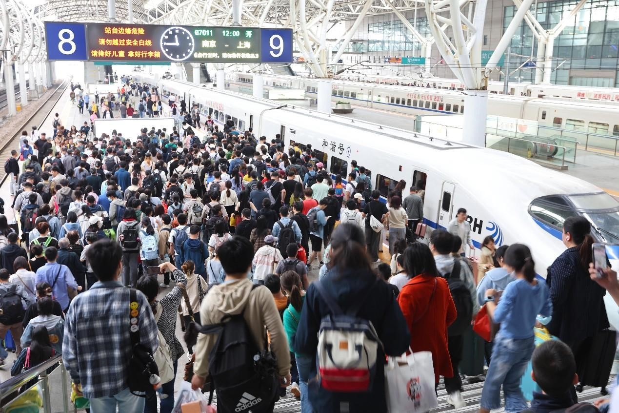 Photo taken on May 3, 2023 shows passengers at the Nanjing Railway Station, east China's Jiangsu province. (People's Daily Online/Su Yang)
