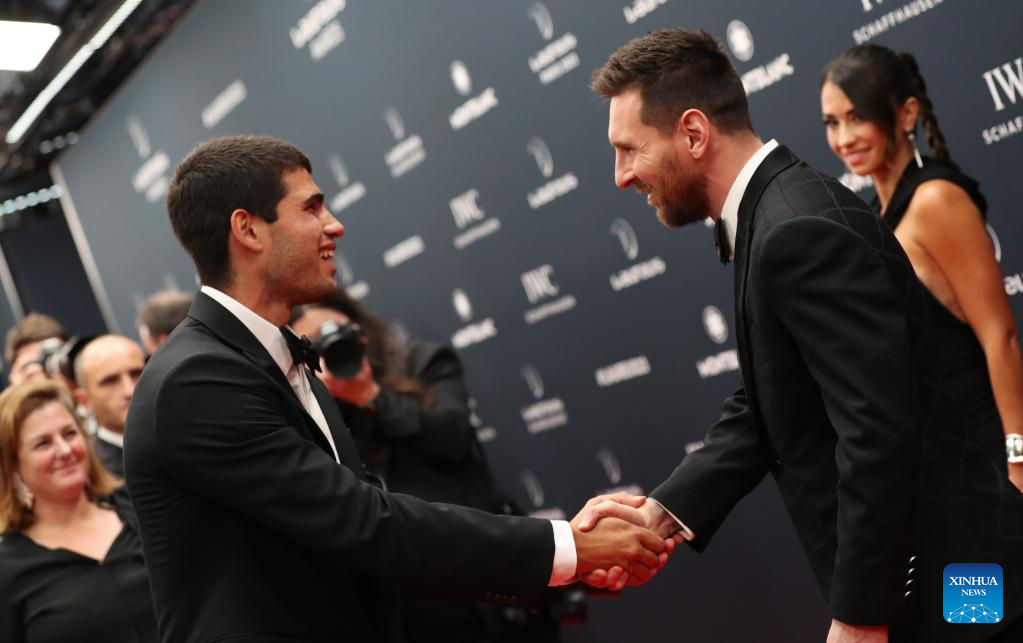 Spanish tennis player Carlos Alcaraz (L) shakes hands with Argentinian football player Lionel Messi on the red carpet prior to the 2023 Laureus World Sports Awards ceremony in Paris, France, May 8, 2023. (Xinhua/Gao Jing)