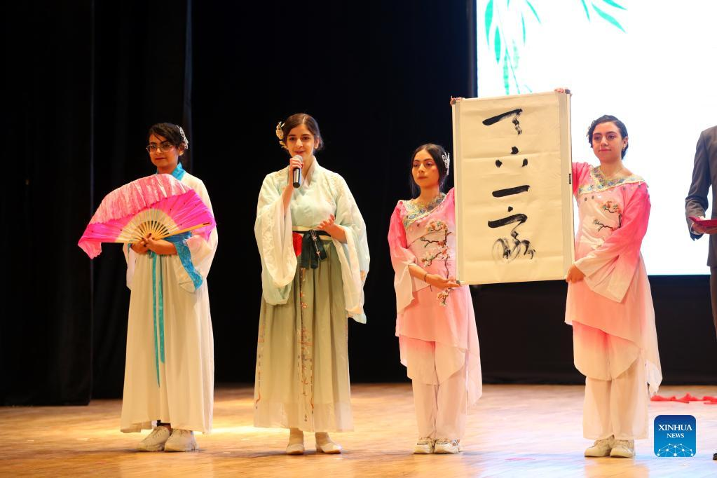 Loay Adel Mohamed (1st L), a senior from Cairo University, performs during the "Chinese Bridge" competition for Egyptian university students in Ismailia, Egypt, on May 8, 2023. The 22nd "Chinese Bridge" competition for Egyptian university students concluded on Monday at the Suez Canal University in the northern province of Ismailia. (Xinhua/Sui Xiankai)
