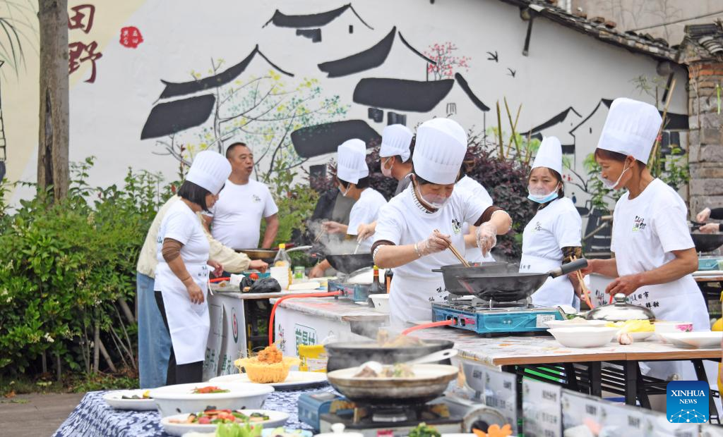 Chefs cook local specialties during a culinary competition in Tianshi Township, Xianju County of Taizhou City, east China's Zhejiang Province. The culinary competition attracted many tourists to enjoy the delicacies. (Photo by Wang Huabin/Xinhua)