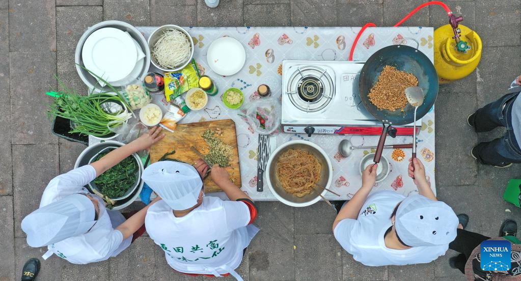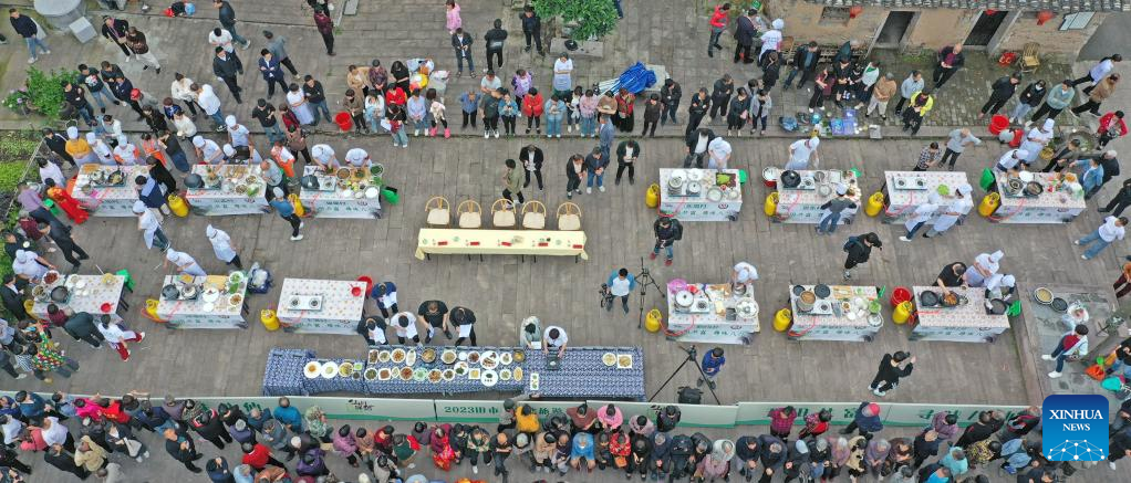 This aerial photo taken on May 8, 2023 shows chefs cooking local specialties during a culinary competition in Tianshi Township, Xianju County of Taizhou City, east China's Zhejiang Province. The culinary competition attracted many tourists to enjoy the delicacies. (Photo by Wang Huabin/Xinhua)