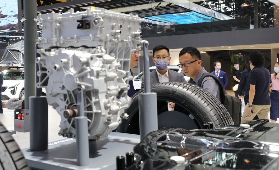 Visitors examining an NEV platform of Cadillac at the 20th Shanghai International Automobile Industry Exhibition in east China's Shanghai, April 18, 2023. (Xinhua/Fang Zhe)