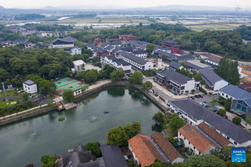 This aerial photo taken on May 8, 2023 shows the view of Dongheng Village of Deqing County, east China's Zhejiang Province. Deqing has been adhering to green development in recent years, making use of traditional cultural resources and developing leisure projects. (Xinhua/Xu Yu)