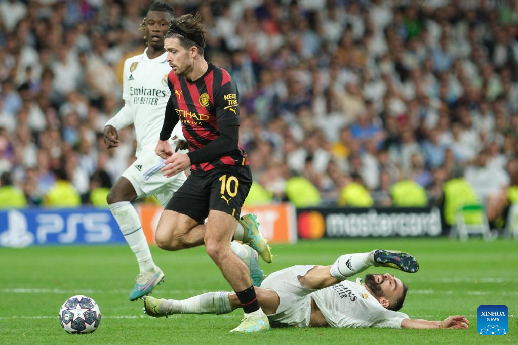 Dani Cavajal (R) of Real Madrid vies with Jack Grealish (C) of Manchester City during the UEFA Champions League semifinal first Leg match in Madrid, Spain, on May 9, 2023. (Xinhua/Meng Dingbo)