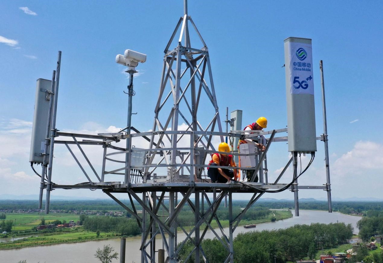 Workers adjust the antenna at a 5G base station in Tongling, east China's Anhui province. (People's Daily Online/Guo Shining)