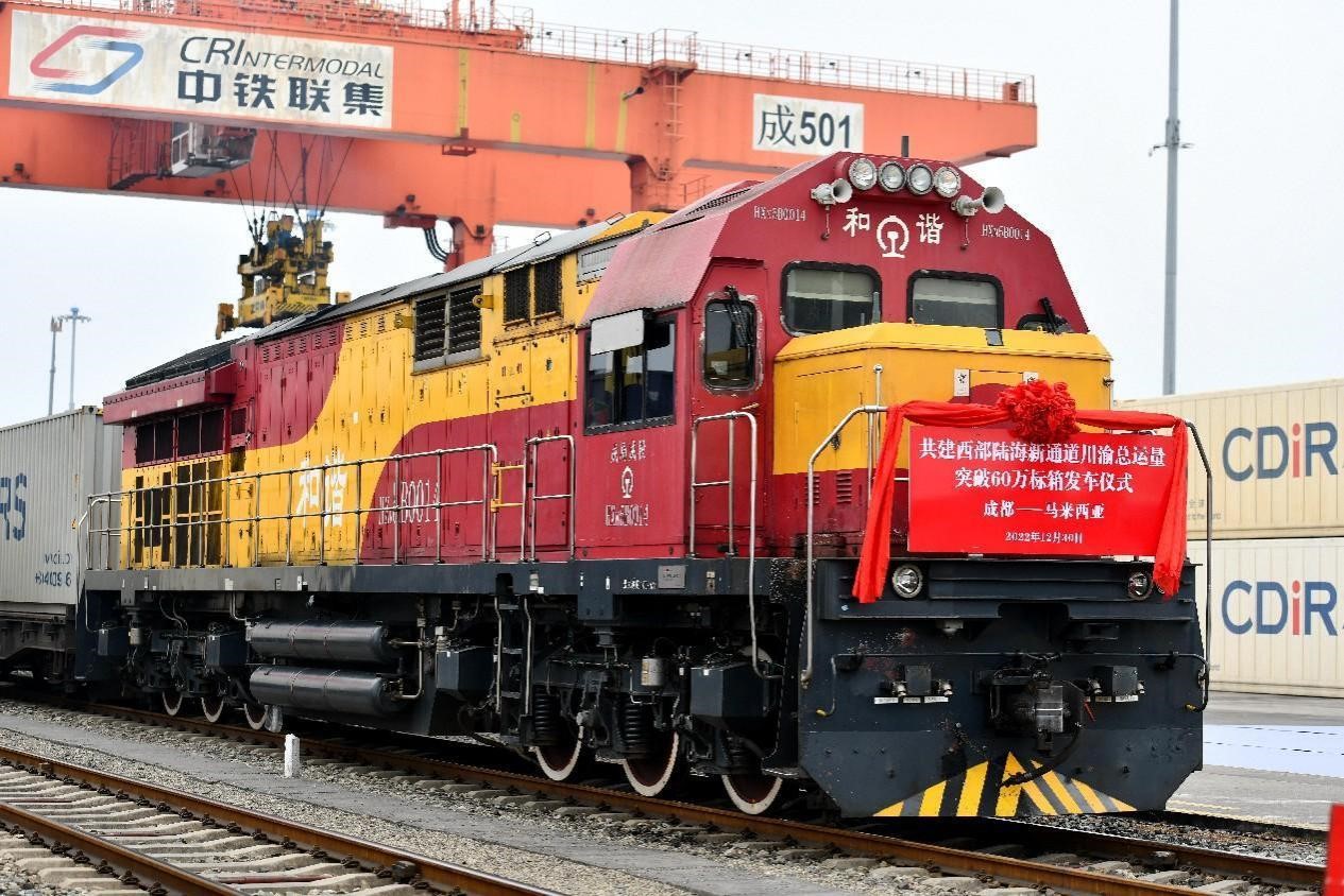 A rail-sea intermodal freight train of the New International Land-Sea Trade Corridor leaves Chengdu, southwest China's Sichuan province, Dec. 30, 2022. (People's Daily Online/Hu Zhiqiang)