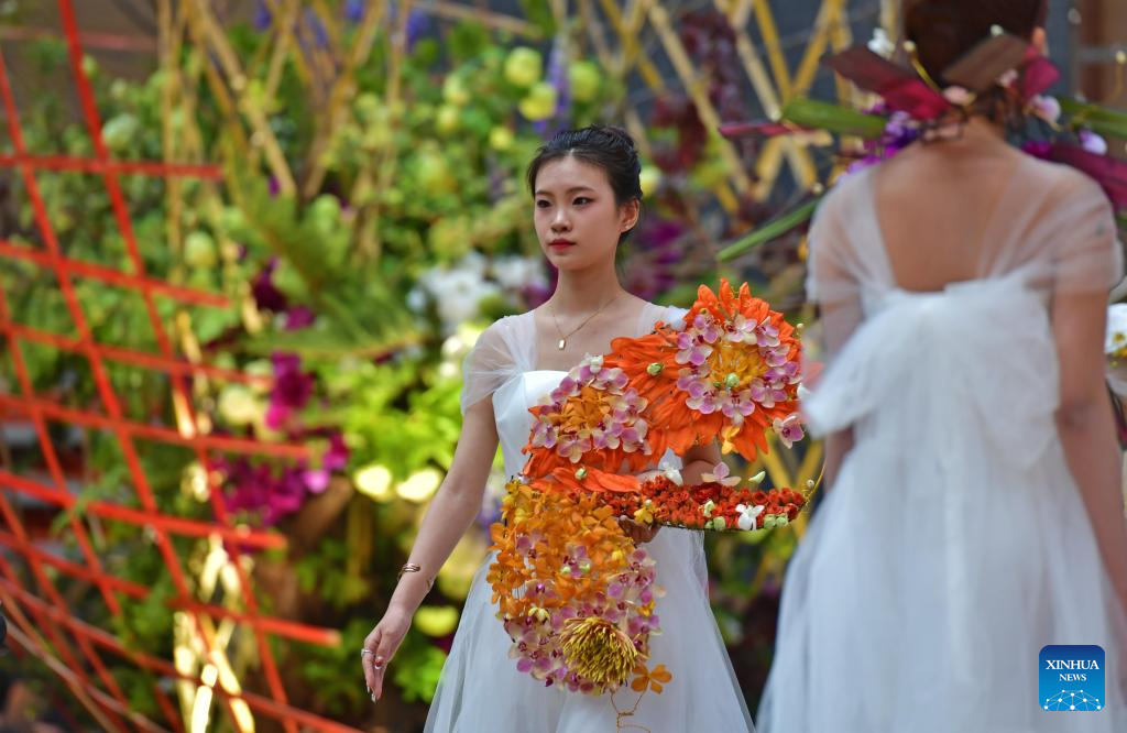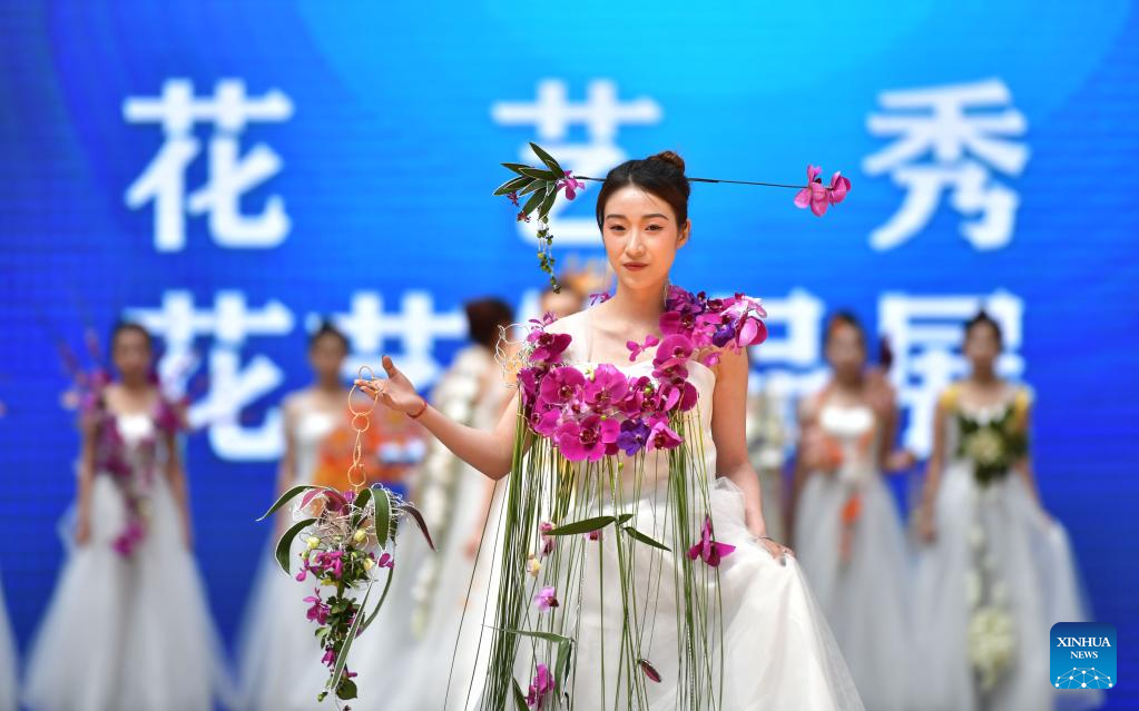 A student from the Liaoning Agricultural Technical College demonstrates flower arrangement artworks in Shenyang, northeast China's Liaoning Province, May 10, 2023. Teachers and professionals in gardening and floriculture presented flower arrangement artworks at the Liaoning Agricultural Technical College on Wednesday. (Xinhua/Yang Qing)